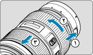 أثناء الضغط على زر تحرير العدسة، قم بإدارة العدسات كما هو مبين بالسهم.