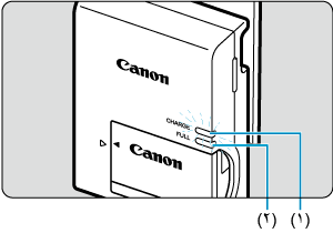 - عند شحن البطارية بالكامل، يضيء مصباح الشحن الكامل (٢) باللون الأخضر.