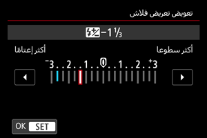 - إذا تم ضبط تعويض تعريض فلاش مع Speedlite، فلا يمكنك ضبط تعويض تعريض فلاش مع الكاميرا. إذا تم ضبط إعداد وحدة الفلاش Speedlite مع كل من الكاميرا ووحدة الفلاش Speedlite، فإنه يتجاوز الكاميرا.