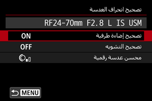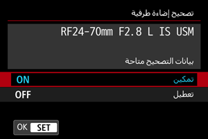 - عند استخدام عدسة غير Canon، يوصى بضبط التصحيحات على [تعطيل] حتى إذا تم عرض [بيانات التصحيح متاحة].