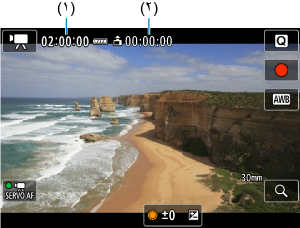 أثناء الاستعداد للتسجيل، يعرض وقت التسجيل المتوفر. أثناء التسجيل، يعرض الوقت المنقضي منذ بدء تسجيل الفيلم (١).