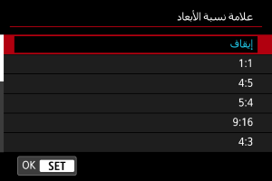 عند تغيير نسبة أبعاد الصورة أثناء تحرير الفيلم المسجل، يمكنك عرض علامات نسبة الأبعاد على شاشة تسجيل الفيلم (أثناء وضعي الاستعداد والتسجيل) حتى يتسنى لك معرفة زاوية الرؤية العرض بعد التحرير.