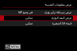 يمكنك عرض مسافة التركيز عند استخدام عدسات RF. في عرض مسافة التركيز، يمكنك تحديد وقت ووحدة القياس.