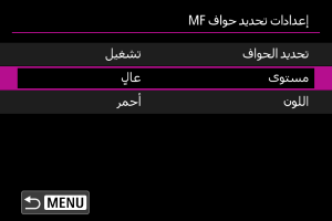 يمكن عرض حواف الأهداف الموجودة في نطاق التركيز بالألوان لجعل التركيز أسهل. يمكنك ضبط مخطط الألوان، و(مستوى) الحساسية لالتقاط الحافة.