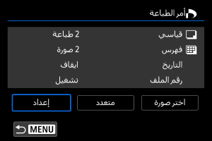 يمكنك ضبط نوع الطباعة ووضع التاريخ ووضع رقم الملف إلخ. سيتم تطبيق إعدادات الطباعة على كل الصور المطلوب طباعتها. (لا يمكن ضبط الإعدادات لكل صورة على حدة).
