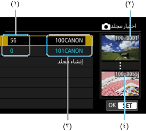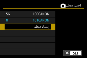 - يمكن للمجلد أن يحتوي على عدد من الصور يصل إلى ٩٩٩٩ صورة (رقم الملف ٠٠٠١–٩٩٩٩). في حالة امتلاء أحد المجلدات، يتم إنشاء مجلد جديد برقم مجلد أكبر برقم واحد تلقائيًا. كذلك، إذا تم إجراء إعادة الضبط اليدوي ()، فسيتم إنشاء مجلد جديد تلقائيًا. يمكن إنشاء المجلدات التي يتم ترقيمها من ١٠٠ وحتى ٩٩٩.