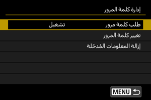 استخدم هذه الإعدادات لإدارة كلمة المرور المُدخلة عند ضبط مفتاح التشغيل على أو استئناف تشغيل الكاميرا من وضع الإيقاف التلقائي. للحصول على تعليمات بشأن إعداد كلمة المرور المطلوبة عند بدء تشغيل الكاميرا، انظر تعيين كلمة مرور.