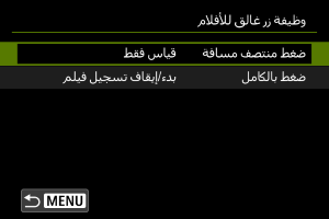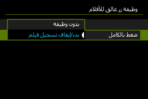 بضبط [ضغط بالكامل] على [بدء/إيقاف تسجيل فيلم]، يمكنك بدء/إيقاف تسجيل الفيلم ليس فقط باستخدام زر تصوير الفيلم وإنما بالضغط أيضًا على زر الغالق تمامًا، أو باستخدام المفتاح البعيد (يُباع بشكل منفصل).