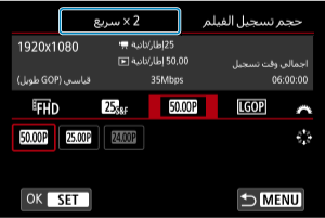 يمكن تسجيل الأفلام للتشغيل بالحركة البطيئة أو السريعة. لن يتم تسجيل الصوت. اضبط سرعة الحركة البطيئة أو السريعة (سرعة التشغيل) في [: حجم تسجيل الفيلم].