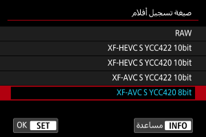 - يمكنك اختيار تنسيق تسجيل الفيلم الفرعي في إعداد [
