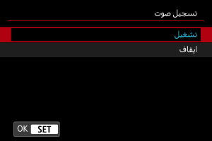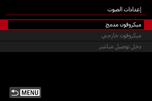 حدد [تشغيل] لتسجيل الصوت أثناء تسجيل الفيلم. يتم استخدام الميكروفون المدمج للتسجيل ما لم تستخدم ميكروفونات خارجية أو مصممة لقاعدة الوظائف المتعددة.