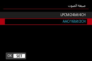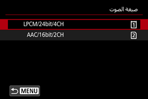 - يؤدي تحديد [LPCM/24bit/4CH] إلى تمكين تسجيل الصوت رباعي القنوات. يؤدي تحديد [AAC/16bit/2CH] إلى تقييد التسجيل على قناتين (بميكروفون واحد).