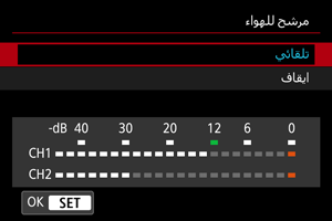 اضبط على [تلقائي] (أو [تشغيل]) لتقليل تشويش الصوت في المشاهد الخارجية العاصفة. عندما تفعيل وظيفة مرشح الهواء، سيتم أيضًا تقليل جزء من أصوات الجهير المنخفض.