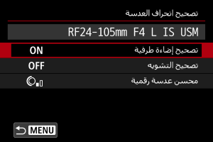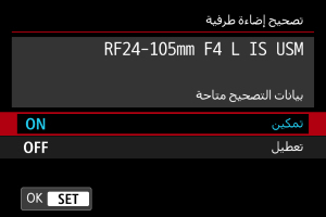 - عند استخدام عدسة غير Canon، يوصى بضبط التصحيحات على [تعطيل] حتى إذا تم عرض [بيانات التصحيح متاحة].
