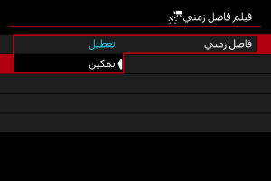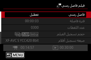 - تقوم العمليات التالية بإلغاء الاستعداد لتسجيل فيلم بفاصل زمني وتغيير الإعداد إلى [تعطيل].