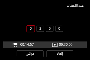 يشير إلى الوقت المطلوب لتصوير عدد معين من اللقطات بفاصل زمني محدد. إذا تجاوزت ٢٤ ساعة، فسيتم عرض "*** أيام".