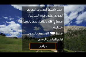 - عند تسجيل أفلام بفاصل زمني في إضاءة منخفضة، قد تبدو الصورة المعروضة أثناء التصوير مختلفة عما هو مسجل بالفعل في الفيلم. وفي تلك الحالات، ستومض الأيقونة [