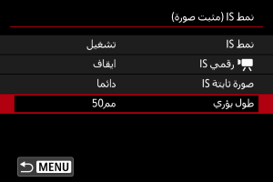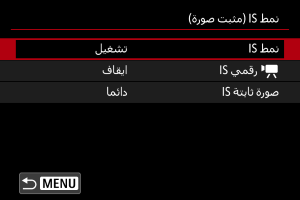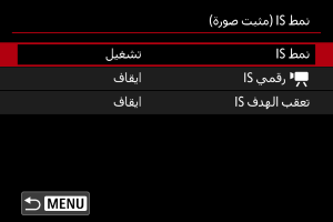 ينشط تثبيت الصورة باستخدام الوضع IS للعدسة. يتم عرضه عند استخدام عدسات IS بدون مفتاح IS. لا يتم عرضه للعدسات الأخرى.