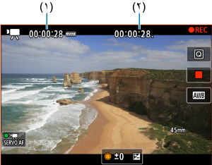 أثناء الاستعداد للتسجيل، يعرض وقت التسجيل المتوفر. أثناء التسجيل، يعرض الوقت المنقضي منذ بدء تسجيل الفيلم (١).