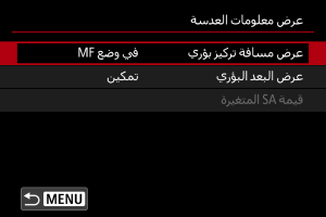يمكنك عرض مسافة التركيز البؤري عند استخدام عدسات RF أو RF-S. في عرض مسافة التركيز، يمكنك تحديد وقت ووحدة القياس.