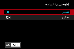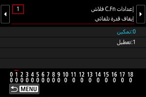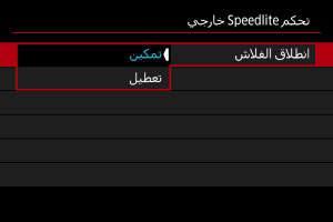لتمكين التصوير بالفلاش، اضبط على [تمكين]. لتمكين الإشعاع المساعد لضبط البؤرة تلقائيًا في وحدة الفلاش Speedlite فقط، اضبط على [تعطيل].