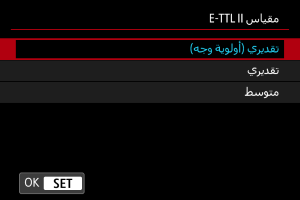 - [قياس الفلاش E-TTL II] هو الوضع القياسي لوحدات الفلاش الخارجي Speedlites من الفئة EL/EX للتصوير بالفلاش التلقائي.