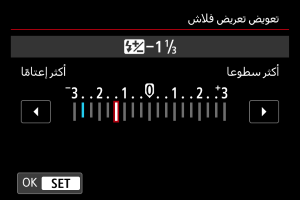 - إذا تم ضبط تعويض تعريض فلاش مع Speedlite، فلا يمكنك ضبط تعويض تعريض فلاش مع الكاميرا. إذا تم ضبط إعداد وحدة الفلاش Speedlite مع كل من الكاميرا ووحدة الفلاش Speedlite، فإنه يتجاوز الكاميرا.