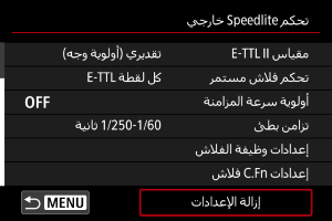 مسح إعدادات الوظيفة المخصصة للفلاش/مسح كل الوظائف المخصصة لوحدة الفلاش Speedlite