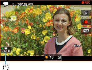 للاستمرار في ضبط البؤرة على نقطة معينة، أو إذا لم تكن ترغب في تسجيل الأصوات الميكانيكية الصادرة عن العدسة، يمكنك إيقاف Movie Servo AF مؤقتًا، بالضغط على [وقف مؤقت Movie Servo AF] (١) أسفل يسار الشاشة.