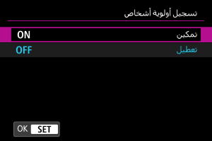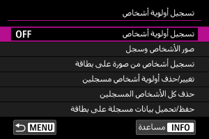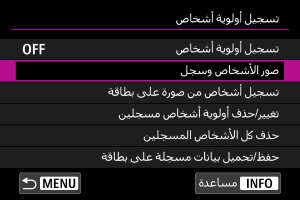 يمكنك تسجيل الأشخاص على الكاميرا لتجعلها تكتشف وجوههم ومن ثم تحدد الأولويات المناسبة لهم من حيث التركيز البؤري والسطوع ودرجة اللون عند التصوير. لتسجيل وجه أحد الأشخاص، يمكنك التقاط صورة لهذا الشخص، أو يمكنك استخدام صورة له على البطاقة.