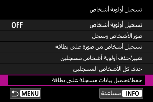 يمكن حفظ بيانات الوجه المسجلة على بطاقة. يمكن أيضًا تحميل البيانات المسجلة المحفوظة بواسطة كاميرا EOS R6 Mark III من بطاقة.