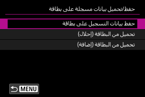 لإضافة البيانات المسجلة من البطاقة إلى الكاميرا، حدد [تحميل من البطاقة (إضافة)]. لا يتم حذف أي بيانات مسجلة موجودة على الكاميرا.