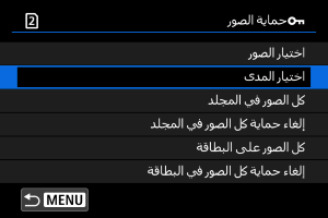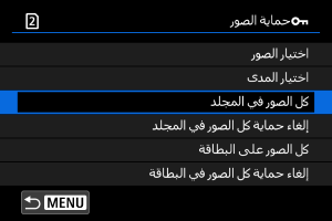 - لإلغاء الحماية، حدد [إلغاء حماية كل الصور في المجلد] أو [إلغاء حماية كل الصور في البطاقة].