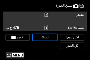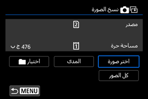 إذا كانت هناك صورة بنفس رقم الملف في المجلد المستهدف أو البطاقة المستهدفة، فسيتم عرض [تخطي الصورة واستمرار] و[استبدال الصورة الموجودة] و[إلغاء النسخ]. حدد طريقة النسخ، ثم اضغط على