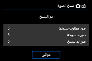 - تُعرض النتائج بعد انتهاء النسخ. حدد [موافق] للعودة إلى الشاشة في الخطوة ٢.