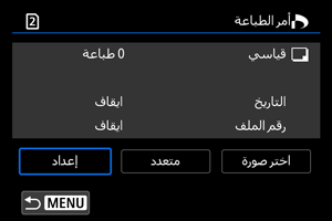 يمكنك ضبط نوع الطباعة ووضع التاريخ ووضع رقم الملف إلخ. سيتم تطبيق إعدادات الطباعة على كل الصور المطلوب طباعتها. (لا يمكن ضبط الإعدادات لكل صورة على حدة).