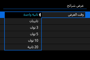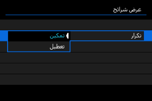 - اضبط إعدادات [وقت العرض] و[تكرار] (تكرار التشغيل) للصور الثابتة.
