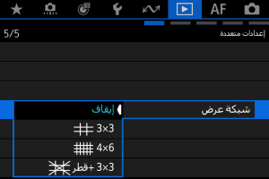 ﻳﻤﻜﻨﻚ ﻋﺮض شبكة ﻋﻠﻰ الصور اﻟﺜﺎﺑﺘﺔ الظاهرة ﻓﻲ تشغيل الصورة المفردة ﻋﻠﻰ شاشة التشغيل. هذه الوظيفة ملائمة للتحقق من الإمالة الرأسية أو الأفقية للصور، وكذلك التشكيل.