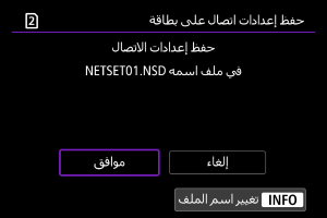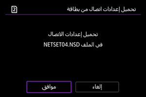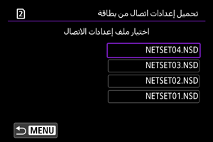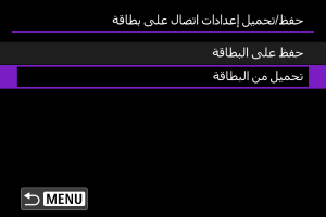 : حفظ/تحميل إعدادات على بطاقة] يُتيح لك حفظ جميع إعدادات الاتصالات في الكاميرا على البطاقة أو تحميل جميع إعدادات الاتصالات على كاميرا أخرى من بطاقة.