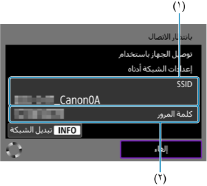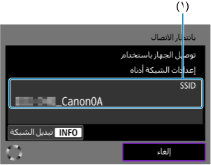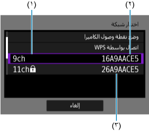 - تشير المساحة الفارغة في (٢) إلى أنه تم اكتشاف أسماء شبكات (SSID) متعددة بالاسم نفسه. يؤدي تحديد اسم شبكة (SSID) بمساحة فارغة في (٢) إلى توصيل الكاميرا بنقطة الوصول التي تحتوي على أقوى إشارة.
