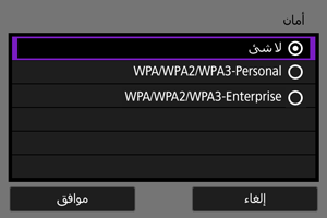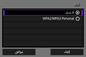 - يجب ضبط نوع الأمان نفسه على كل من الجهاز الآخر والكاميرا. راجع طرق المصادقة وتشفير البيانات للحصول على تفاصيل حول أنواع المصادقة والتشفير.