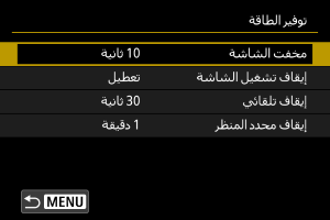 - [مخفت الشاشة] و[إيقاف تشغيل الشاشة] يُطبقان أثناء عرض شاشة التصوير. لا تنطبق هذه الإعدادات أثناء عرض القائمة أو تشغيل الصورة.