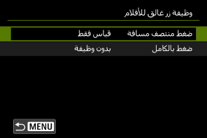 بضبط [ضغط بالكامل] على [بدء/إيقاف تسجيل فيلم]، يمكنك بدء/إيقاف تسجيل الفيلم ليس فقط باستخدام زر تصوير الفيلم وإنما بالضغط أيضًا على زر الغالق تمامًا، أو باستخدام المفتاح البعيد (يُباع بشكل منفصل).