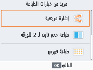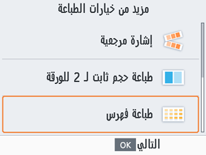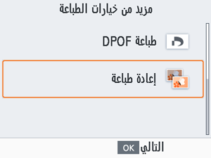 توفر [مزيد من خيارات الطباعة] على الشاشة الرئيسية، ميزة طباعة الفهرس وإعادة الطباعة وميزات أخرى للصور على بطاقات الذاكرة أو محركات فلاش USB.