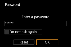 или когато фотоапаратът възстановява работата си след автоматично изключване. Въведете зададената от вас парола.