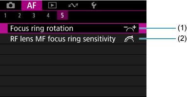 - (5) RF lens MF focus ring sensitivity/Чувствителност на пръстена за фокусиране на RF обектив