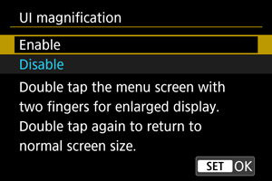 Можете също така да увеличите екраните на менюто, като докоснете дисплея двукратно с два пръста. За да възстановите първоначалния размер, докоснете дисплея двукратно отново.