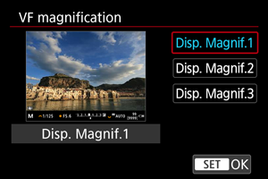 Изберете [: VF magnification/: Увеличение на визьора] (, ).
