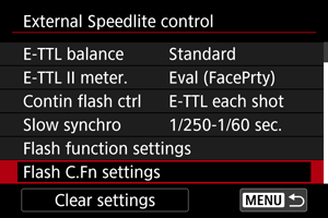Изберете [Flash C.Fn settings/Настройки на потребителските функции на светкавицата].