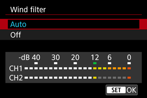 Задайте настройка [Auto/Авто] (или [On/Вкл]), за да намалите изкривяването на звука при сцени на открито със силен вятър. Когато филтърът срещу вятър е включен, се потискат също и част от ниските басови звуци.